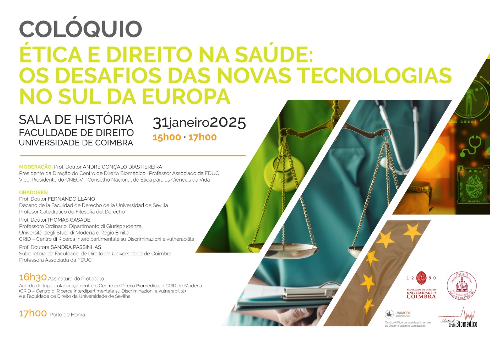 No dia 31 de Janeiro realiza-se na Sala de História da FDUC o Colóquio - Ética e Direito na Saúde: os desafios das novas tecnologias no sul da Europa